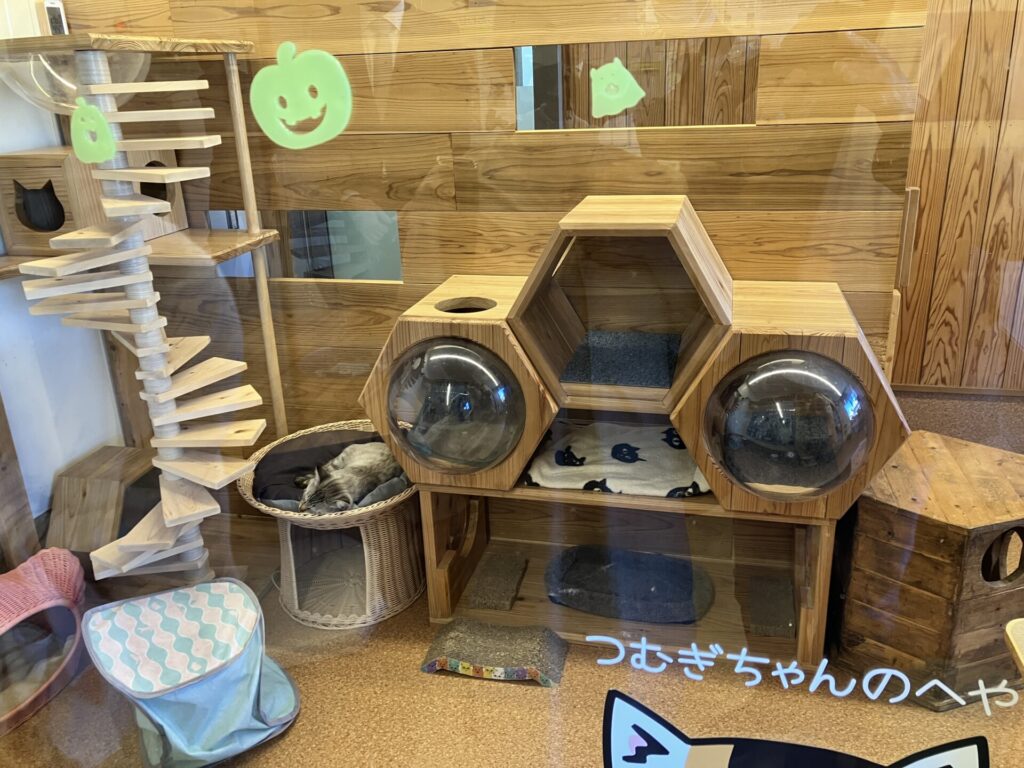 施設の入口を入って右手側には猫が十分快適に暮らせるように、上下運動が可能なキャットタワーや隠れられるBoxを配置。訪れた人が、室内飼育のイメージを具体的に描けるよう工夫されています。