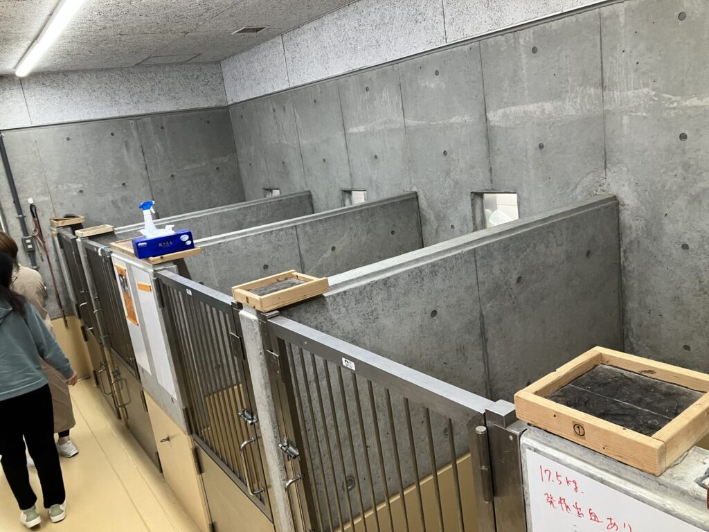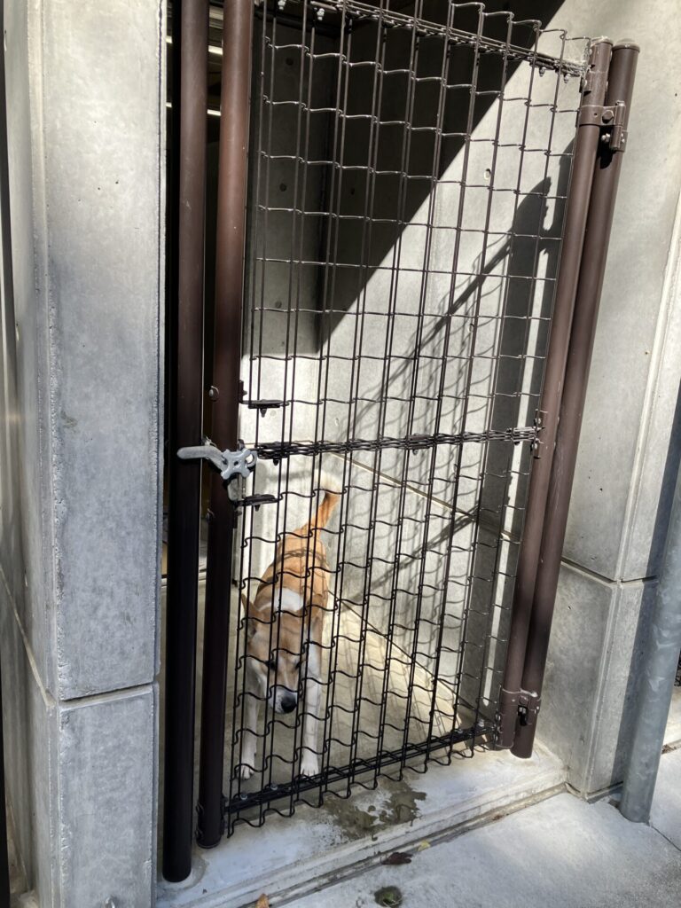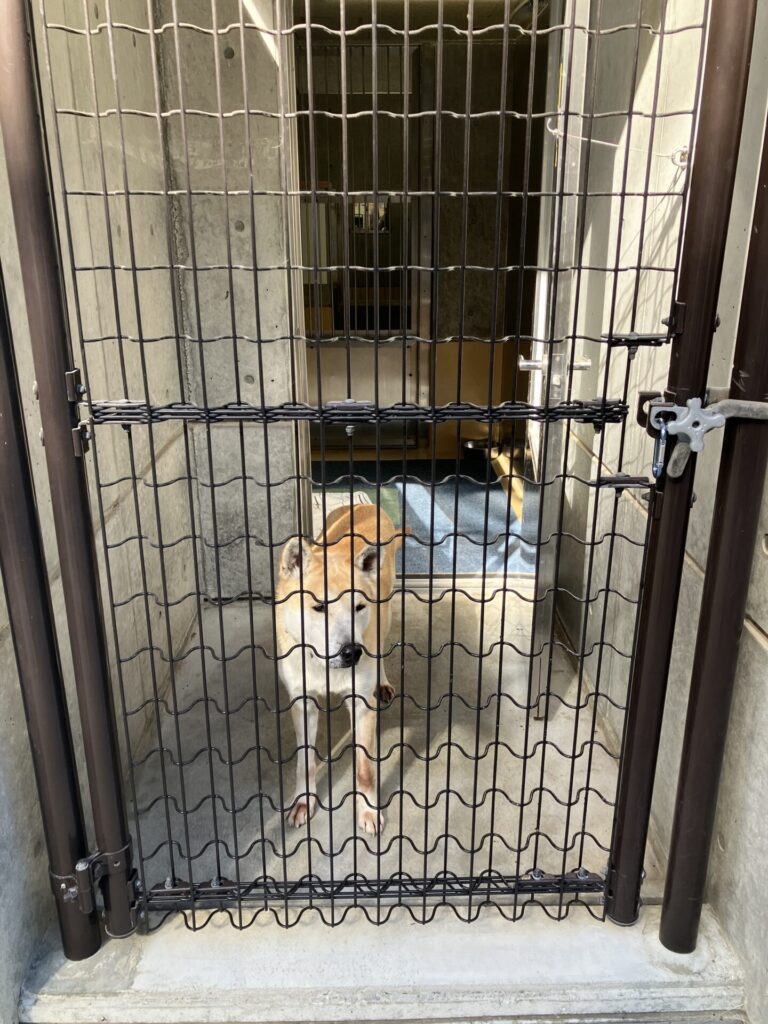 犬の部屋は、1頭ごとに1平方メートルほどの空間が確保され、中の様子が常に確認できる柵になっています。保護犬の運動用にドッグランスペースもありました。