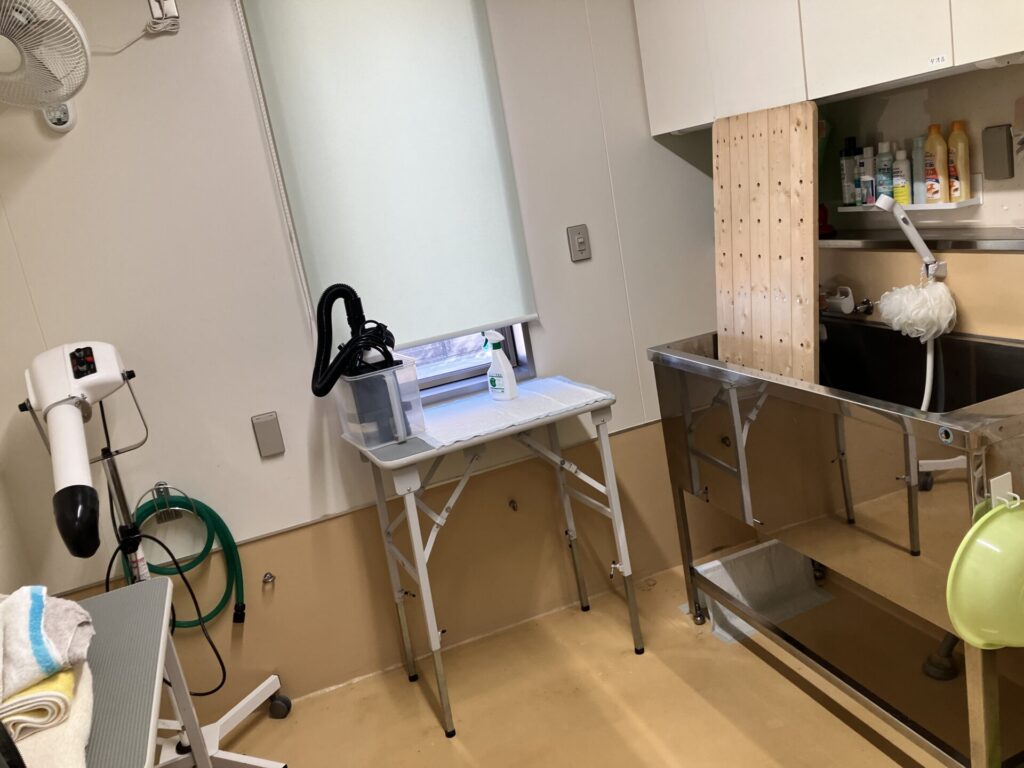 保護されたばかりで汚れている動物のシャンプーやトリミングを行い、衛生状態を改善するために設けられた部屋です。