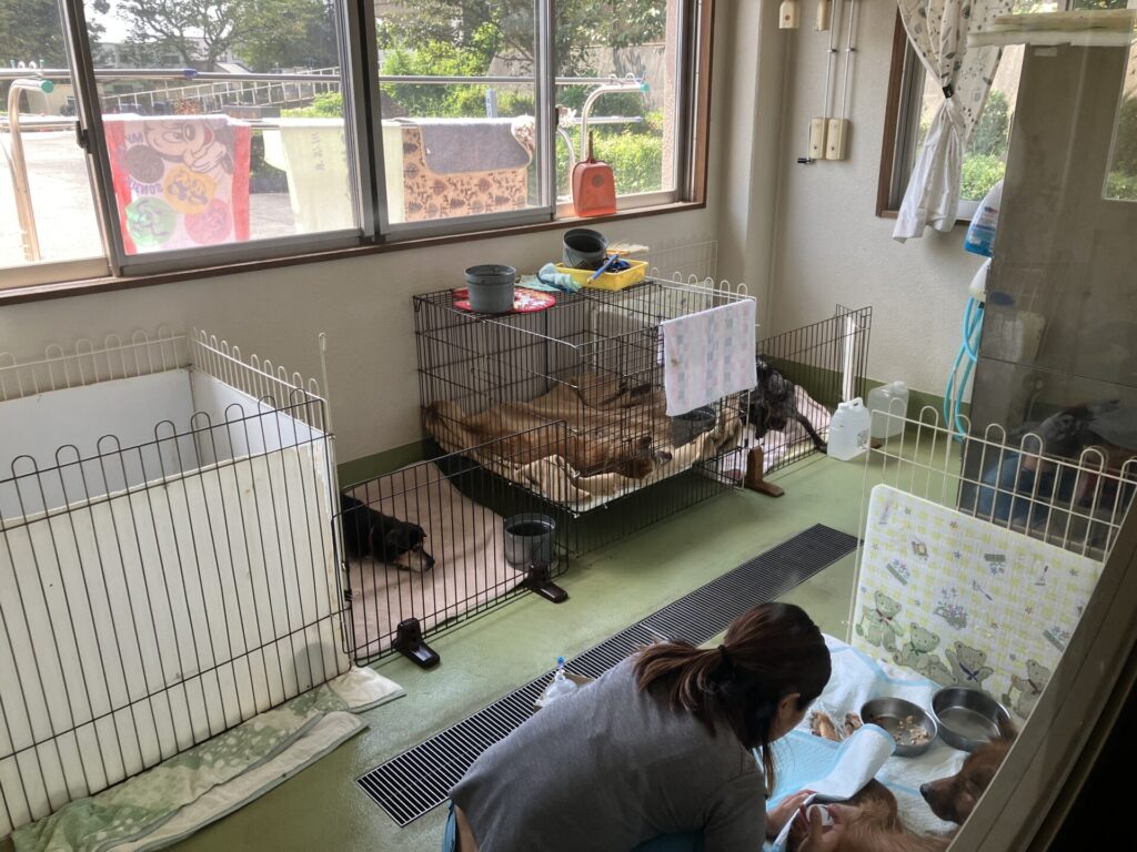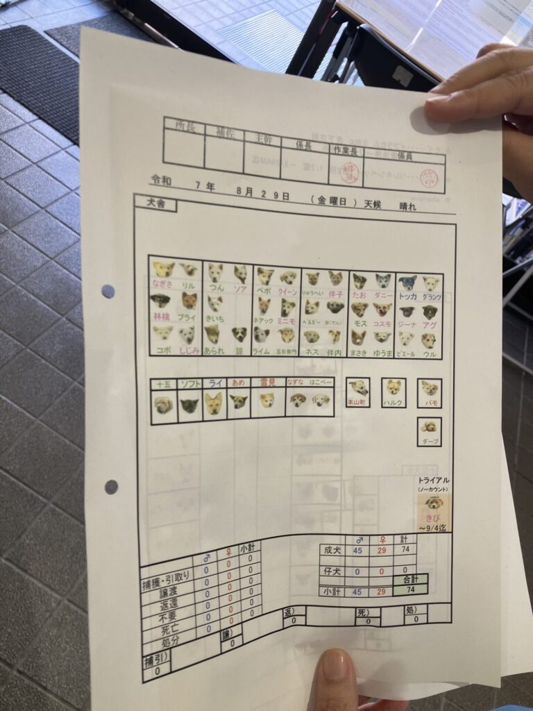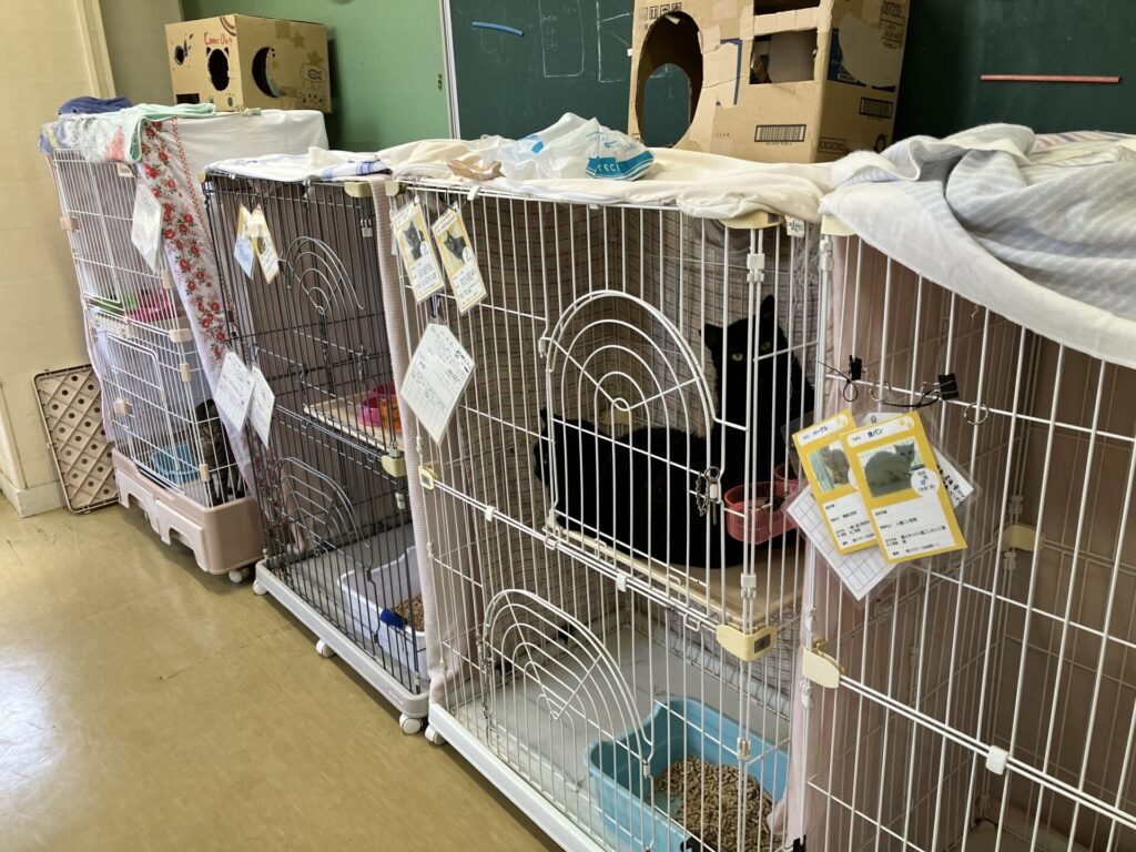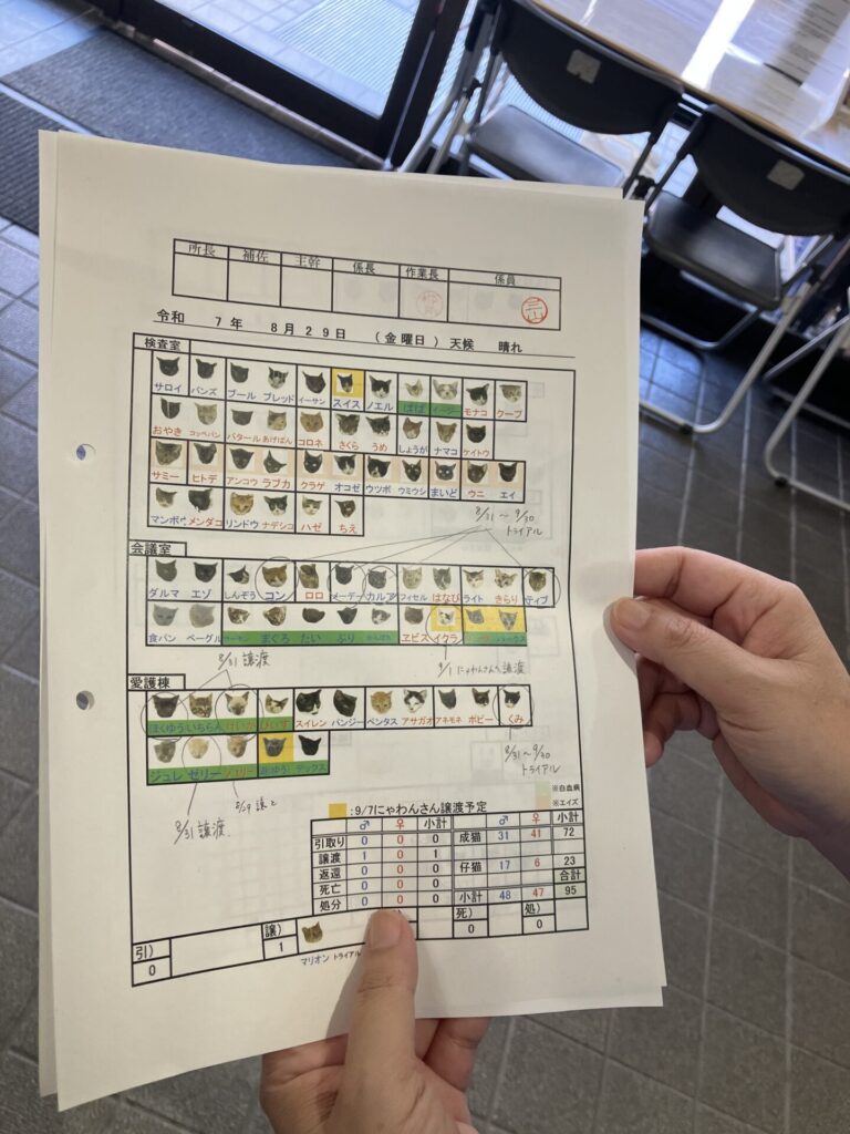 訪問当日(2025年9月1日)の収容状況は猫95頭、犬74頭。特に猫については想定収容数35匹を大幅に超える95頭が収容されており、事務棟の会議室や愛護棟の小型犬舎、治療室の備品置き場まで活用せざるを得ない状況が続いていました。