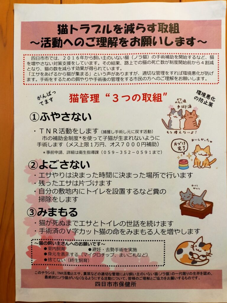 四日市の「ニャンコレスキュー愛の手」さん、鈴鹿の「ムック王国」さん、菰野の「Dep(ディップ)」さんとはお互いに連携し保護活動に努めています。