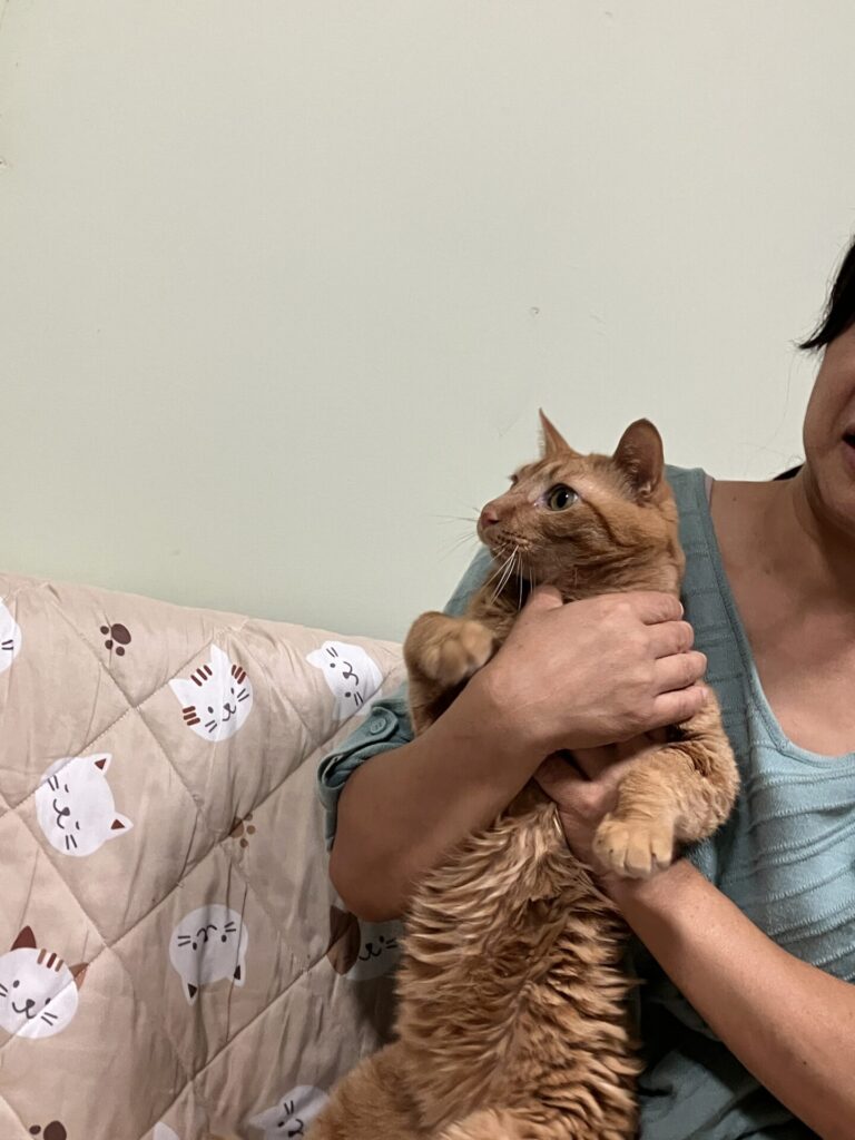 獣に頭や腰を噛まれて、上下の顎が左右に半分ズレてしまい頭蓋骨が陥没し、てんかん発作を頻繁に起こしていた茶トラ猫の「チャチャ」を保護した時のことです。複数の動物病院からは「もう助からない」と言われていました。でも私は1滴ずつミルクを与え、必死に看病しました。現在は元気になりましたが、脳に障害が残ったため、他の猫と争わない優しい性格になりました。